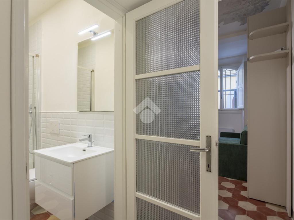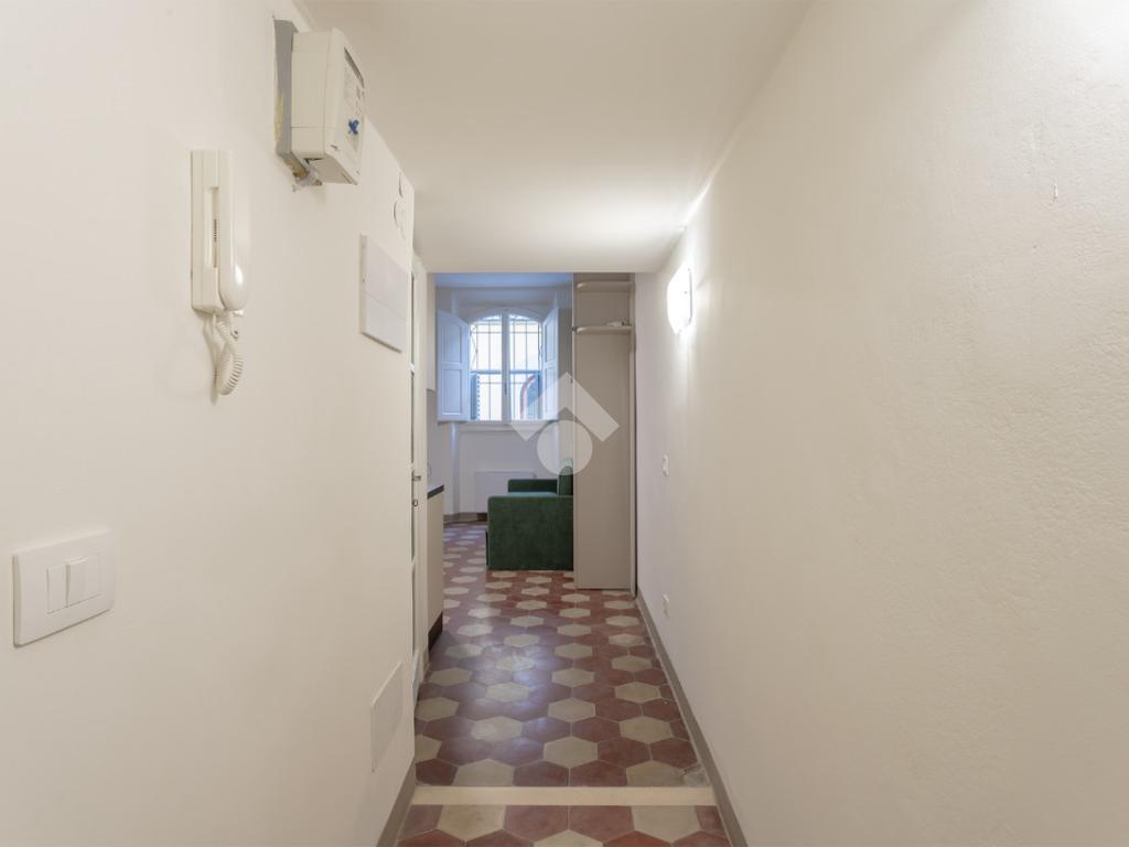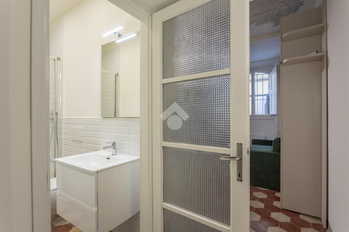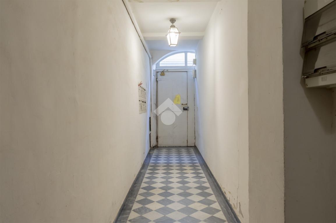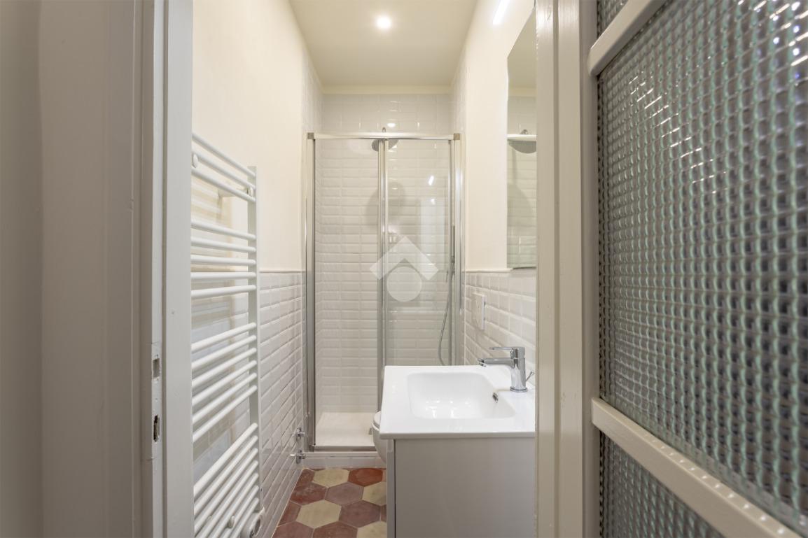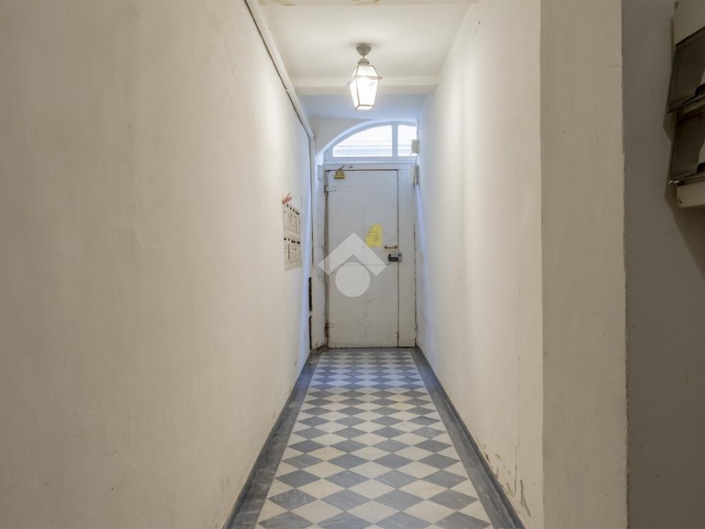 Il monolocale, situato in un classico palazzo del Centro Storico, è composto da un ingresso a corridoio, in cui a sinistra troviamo un bagno con box doccia a vetro.