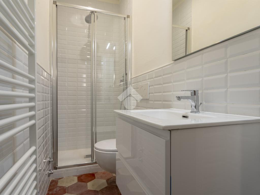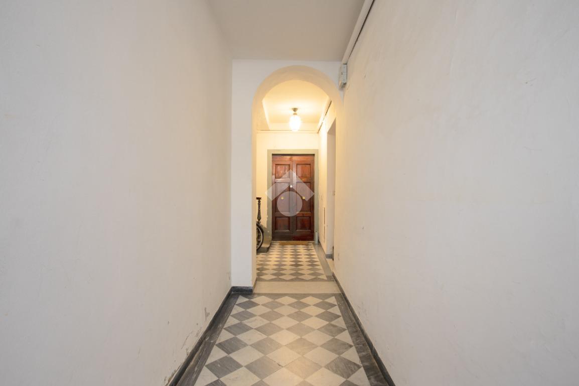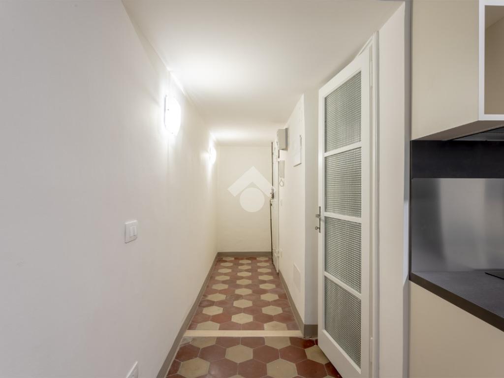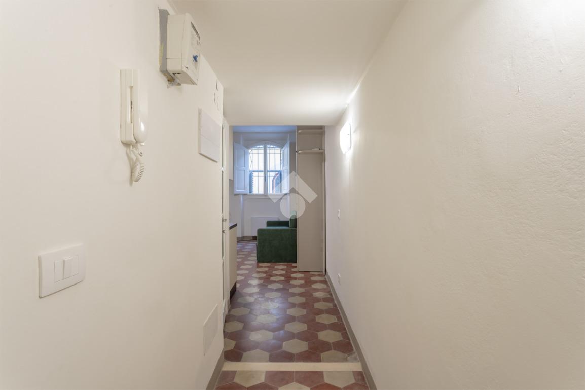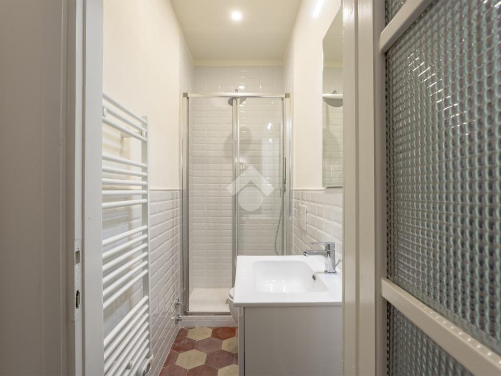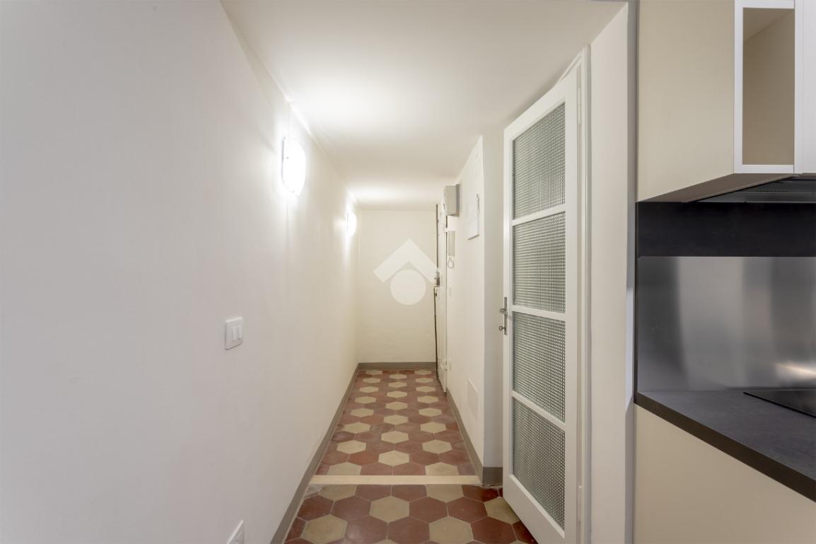 Il monolocale, situato in un classico palazzo del Centro Storico, è composto da un ingresso a corridoio, in cui a sinistra troviamo un bagno con box doccia a vetro.
