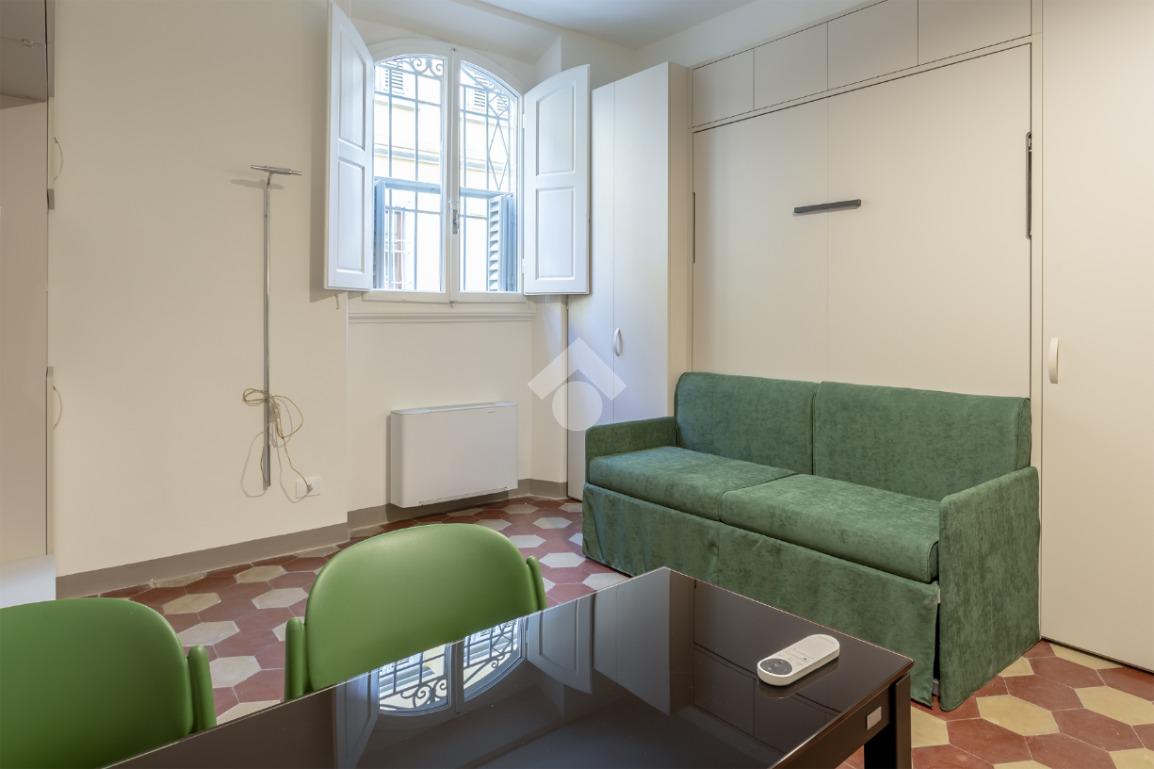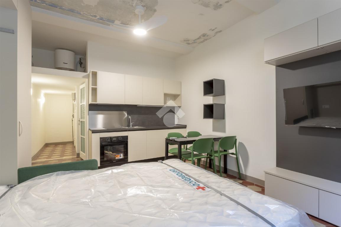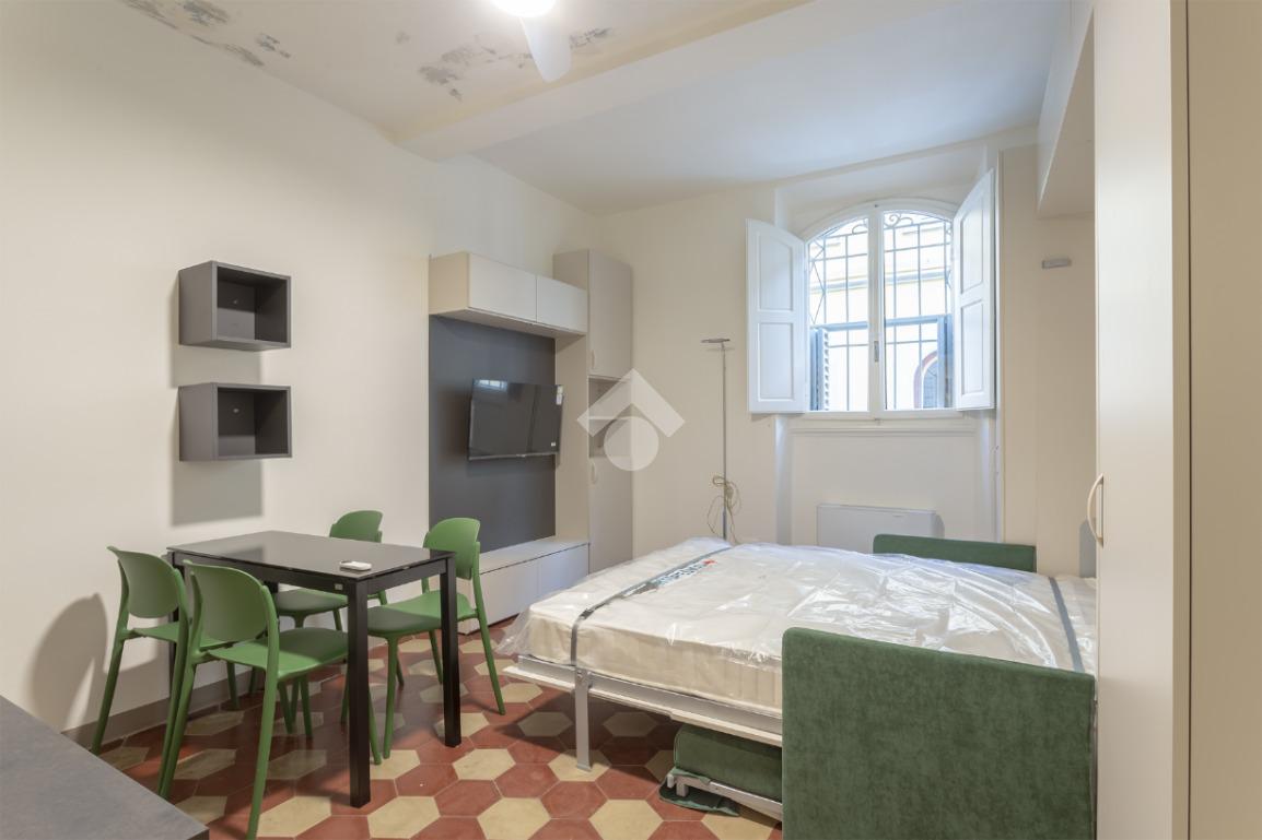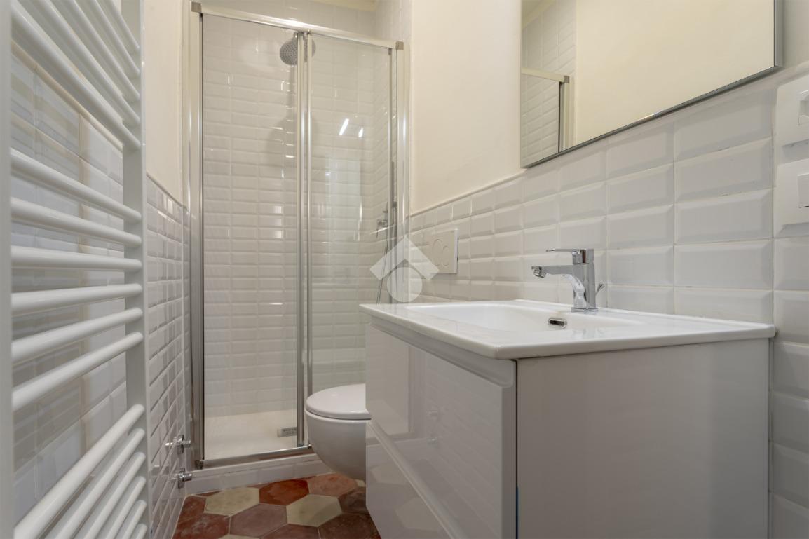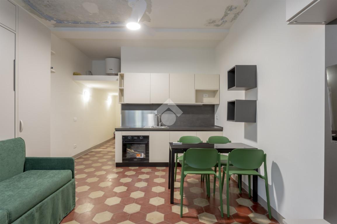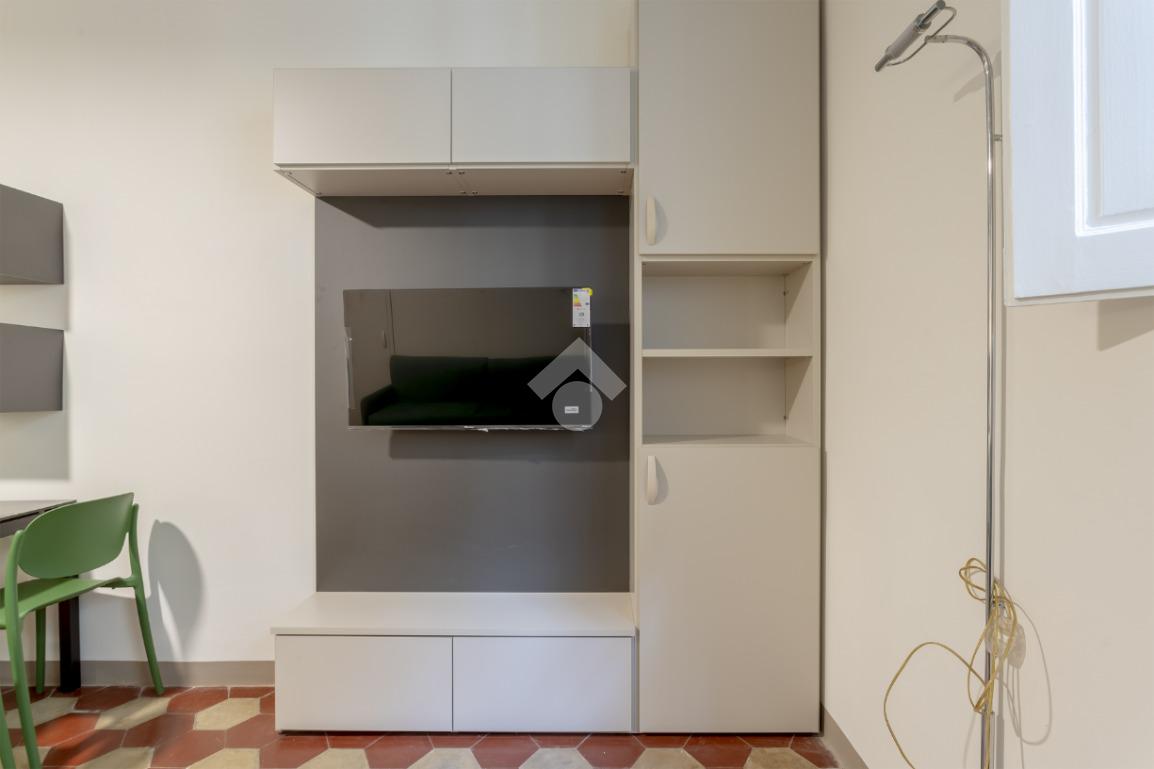 Il monolocale, situato in un classico palazzo del Centro Storico, è composto da un ingresso a corridoio, in cui a sinistra troviamo un bagno con box doccia a vetro.