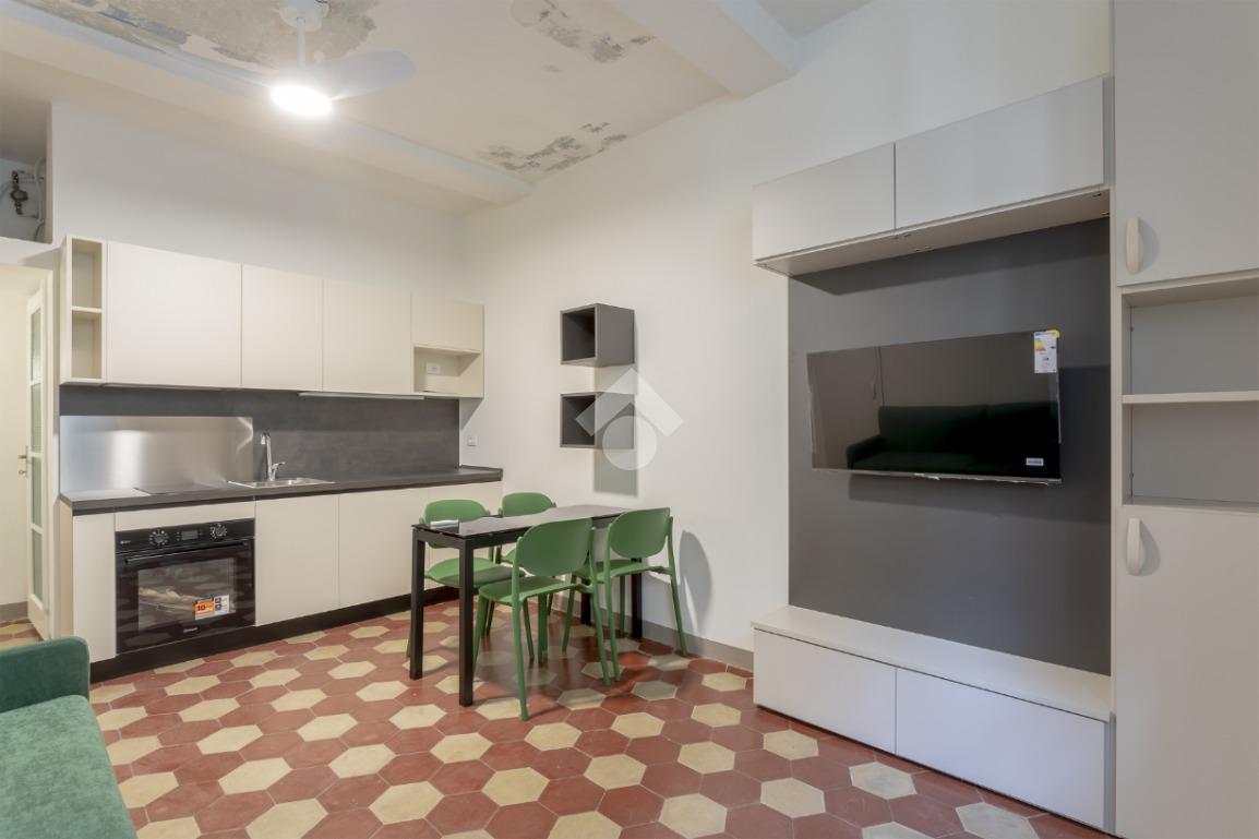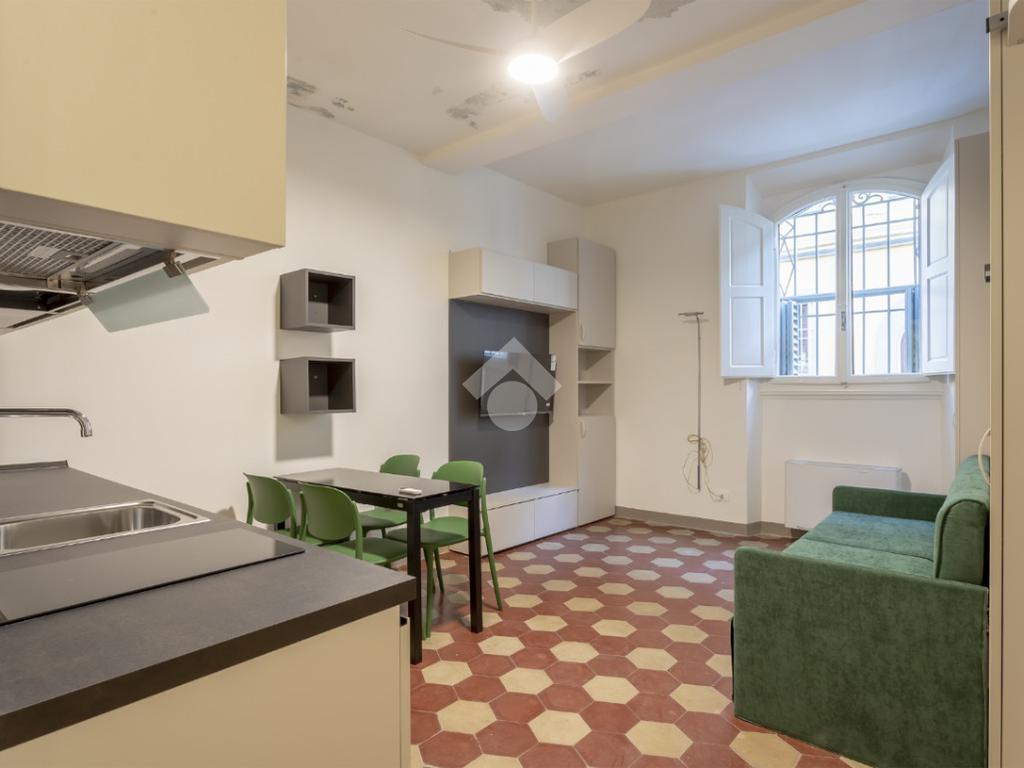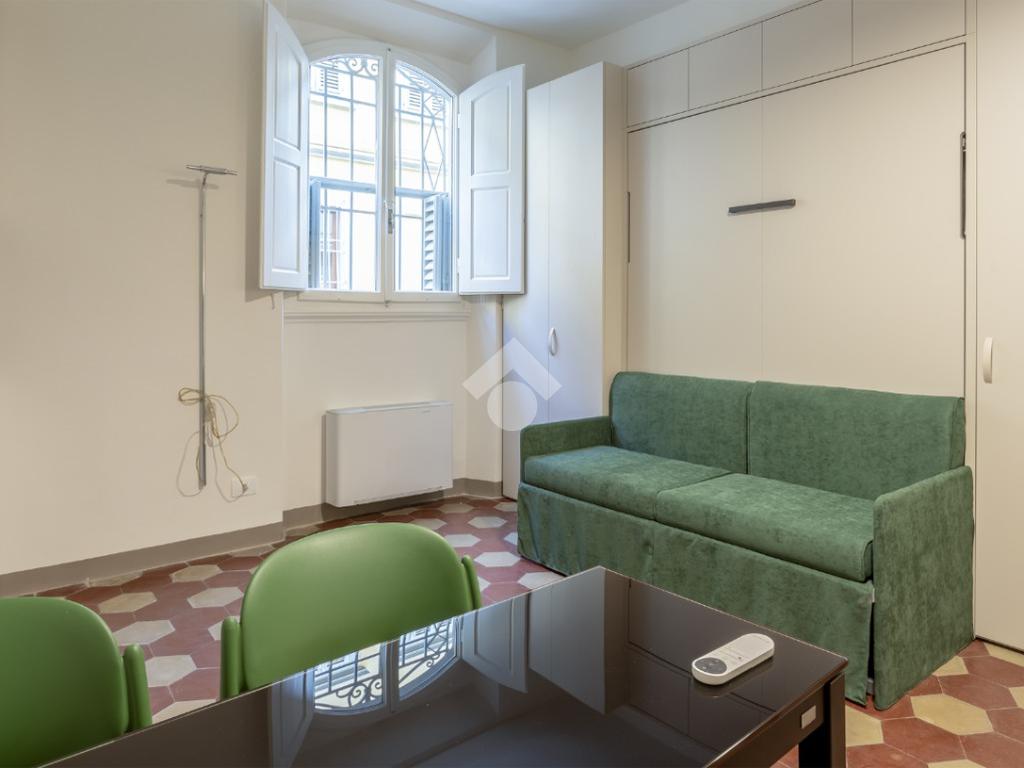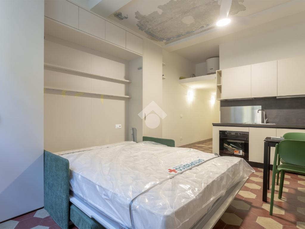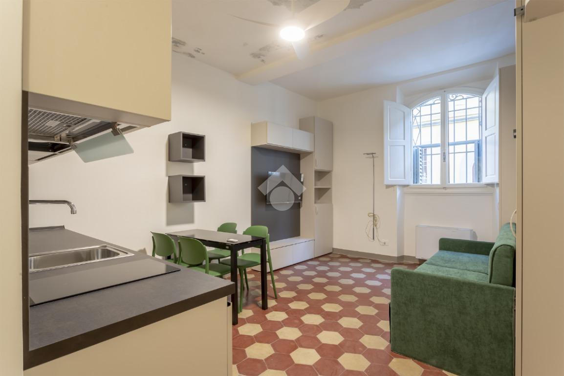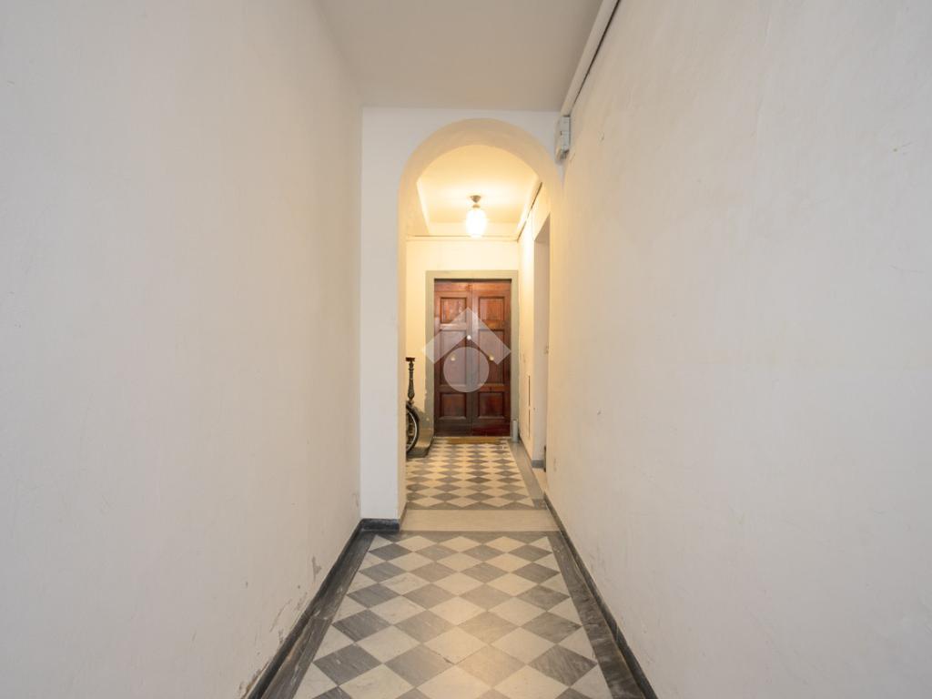 Il monolocale, situato in un classico palazzo del Centro Storico, è composto da un ingresso a corridoio, in cui a sinistra troviamo un bagno con box doccia a vetro.