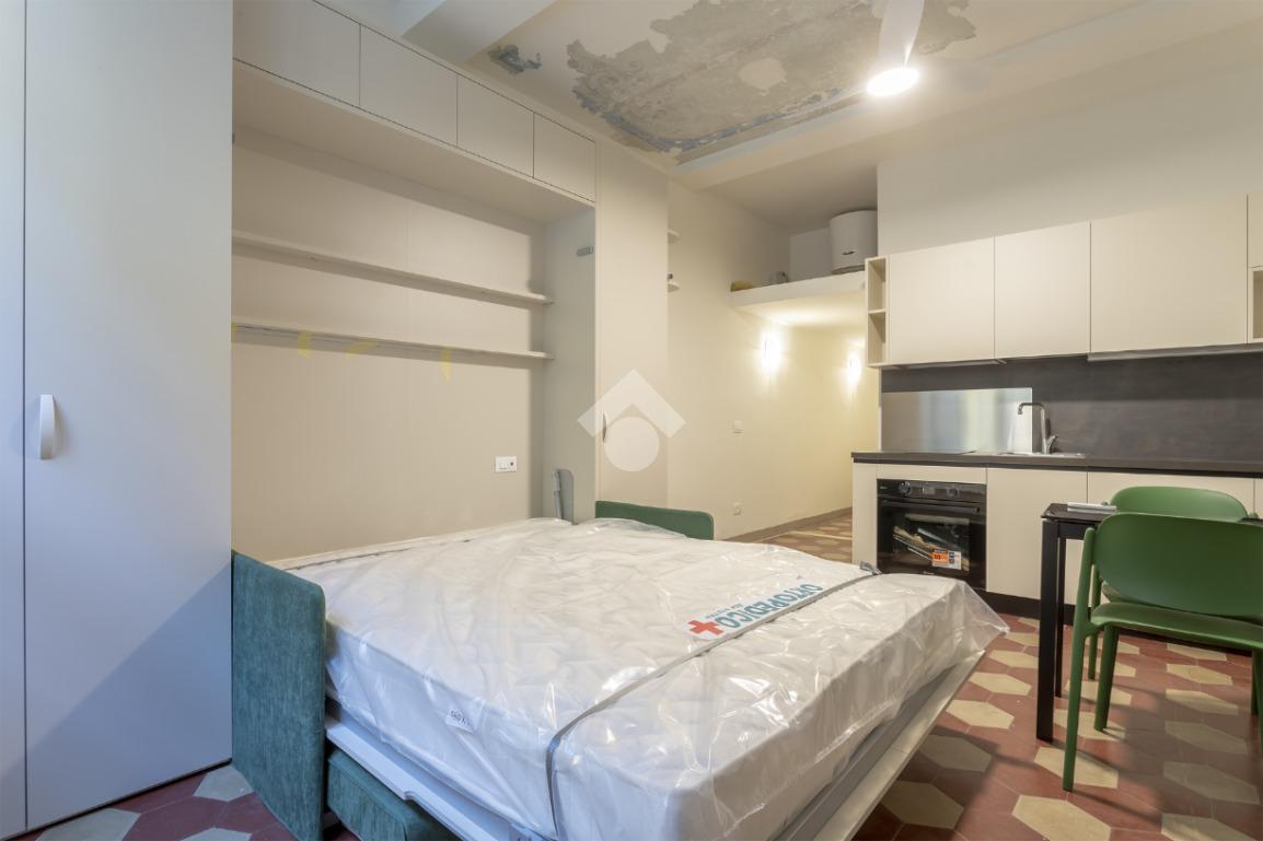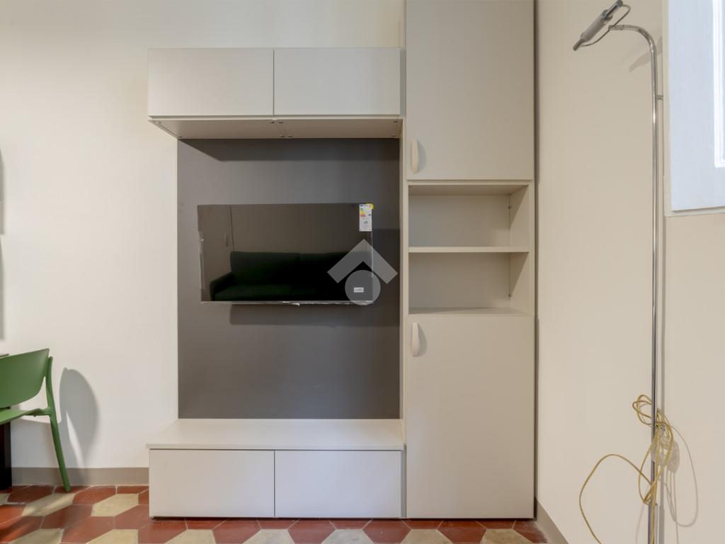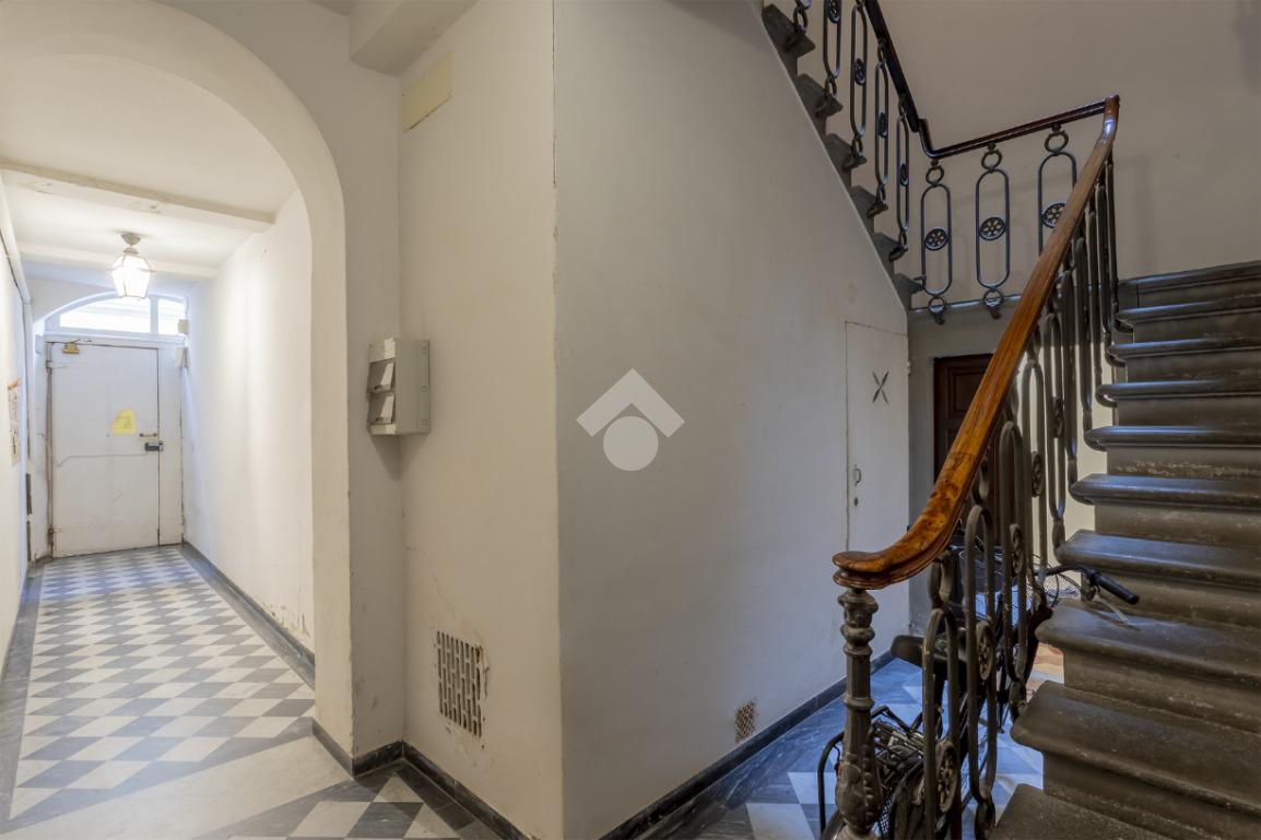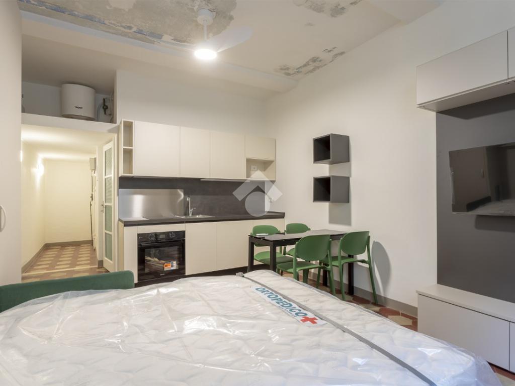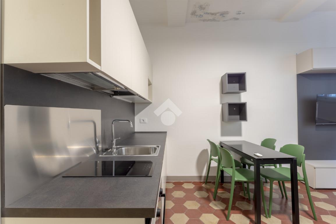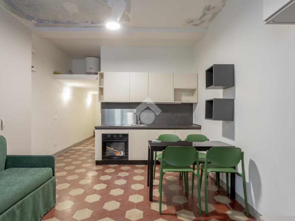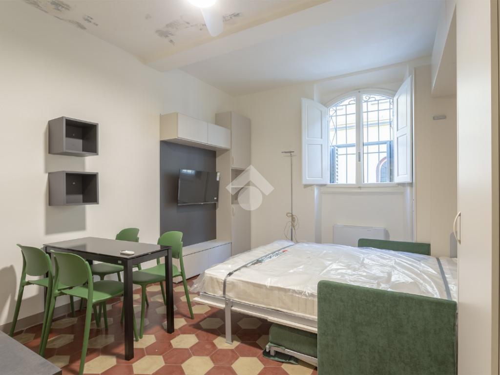 Il monolocale, situato in un classico palazzo del Centro Storico, è composto da un ingresso a corridoio, in cui a sinistra troviamo un bagno con box doccia a vetro.