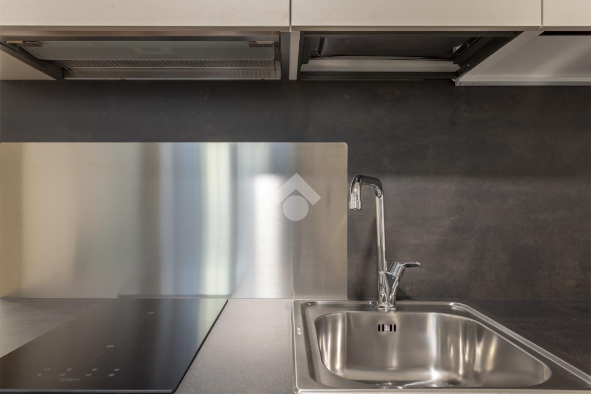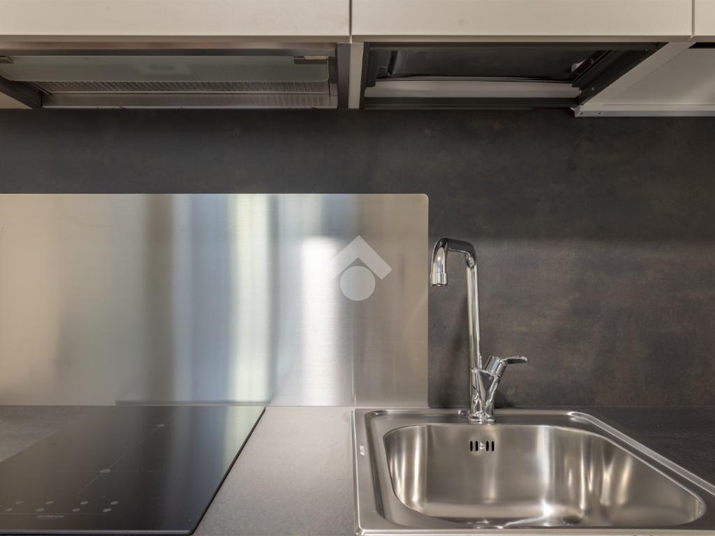 Proseguendo invece, troviamo davanti a noi un soggiorno, con divano, tv a schermo piatto a parete circondata da mobili libreria e organizer. A sinistra, troviamo anche una zona pranzo con angolo cucina, dotata di forno e piastre a induzione.