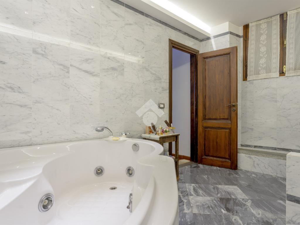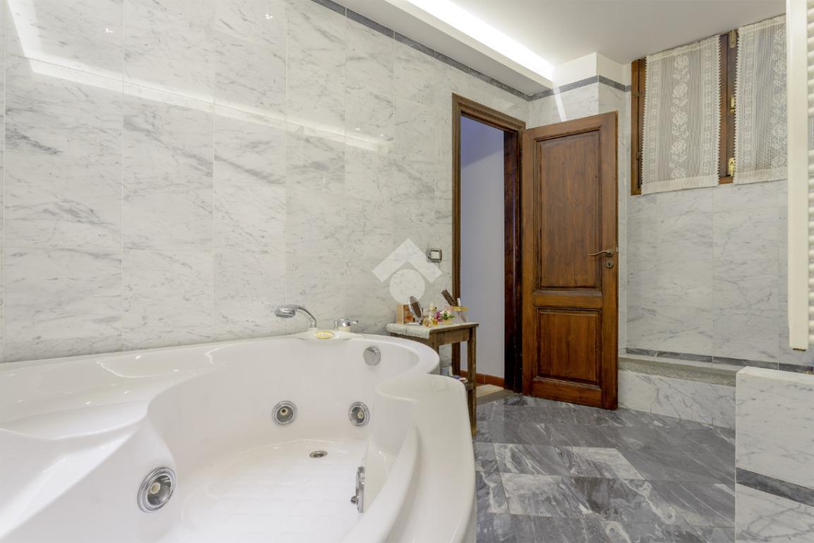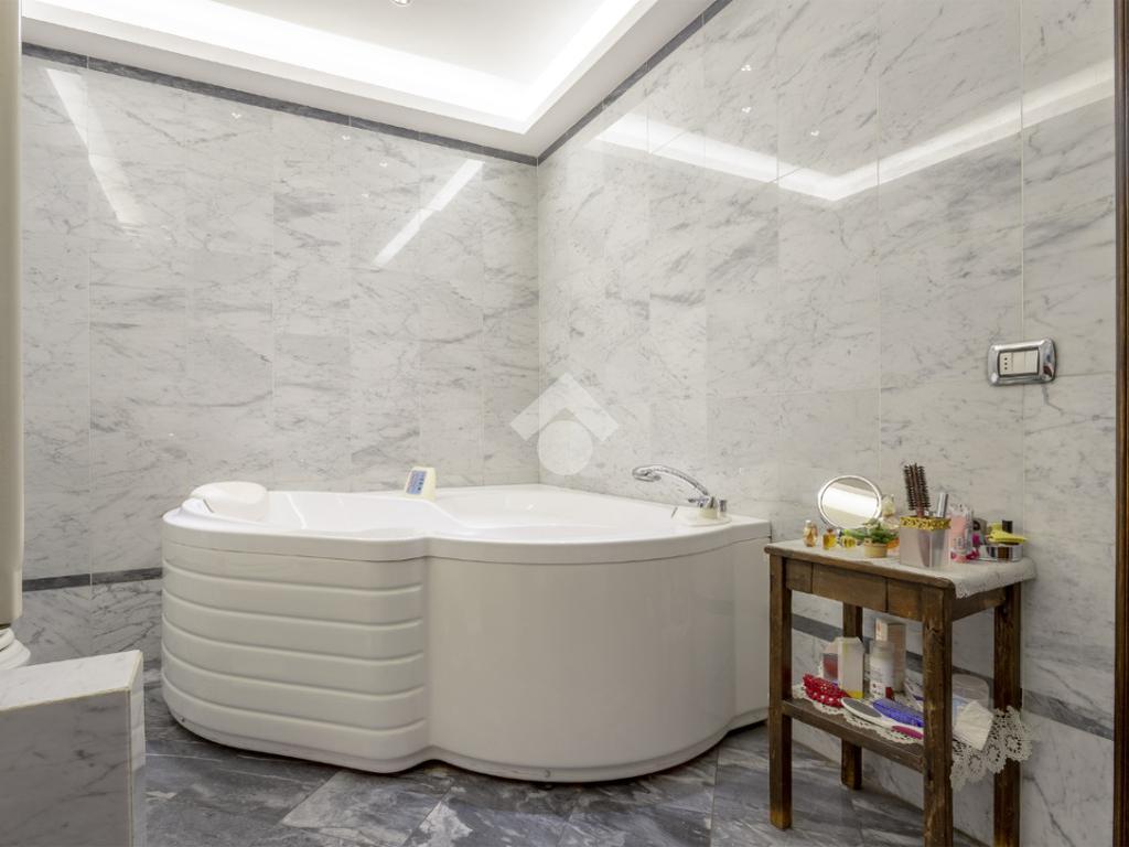Continuando sulla destra, troviamo la camera matrimoniale finestrata con accesso al secondo bagno, anch'esso finestrato, con pavimenti e pareti effetto marmo e vasca da bagno.