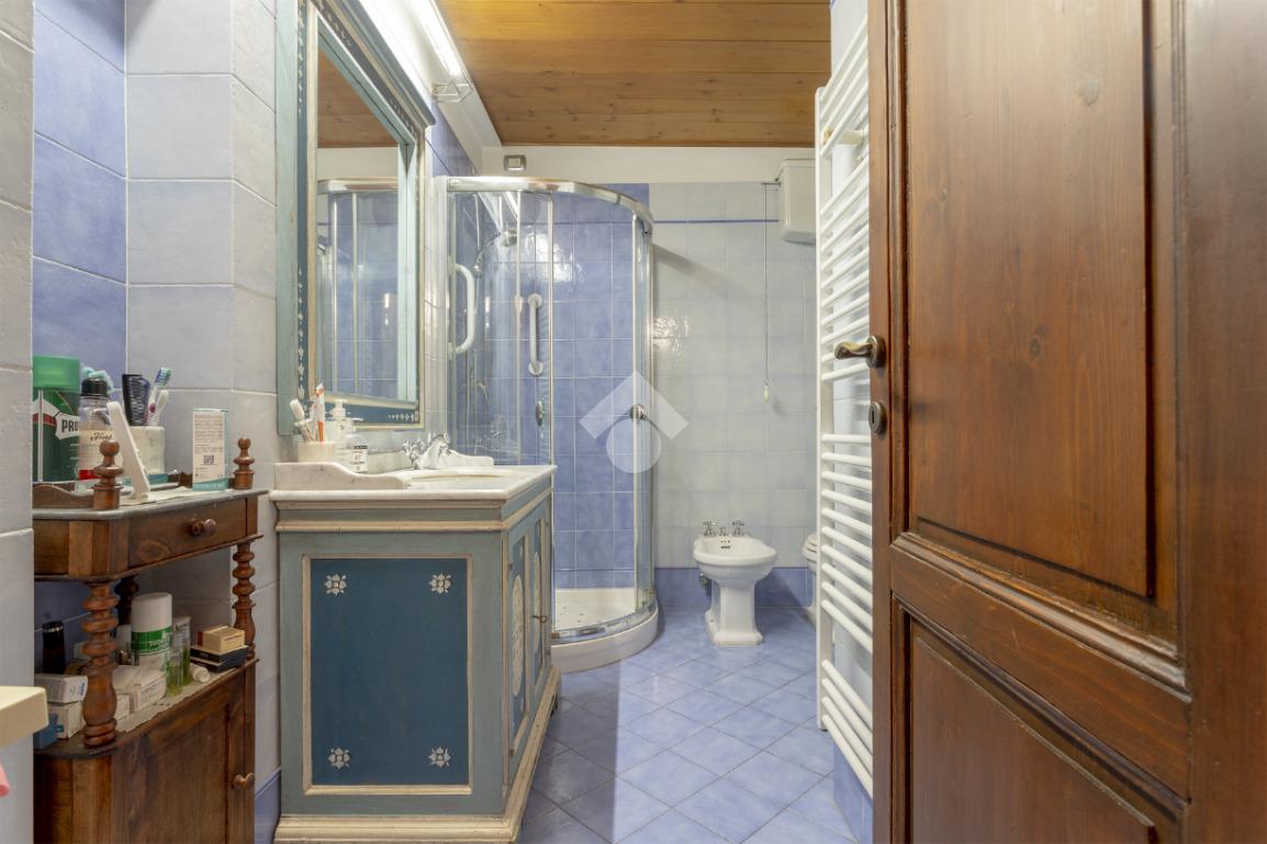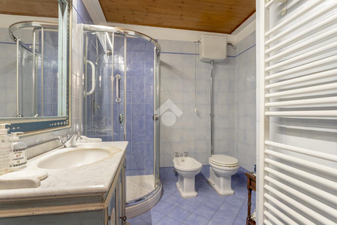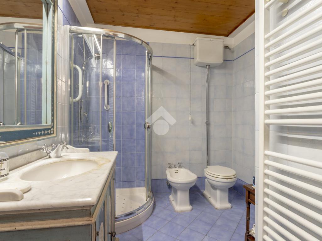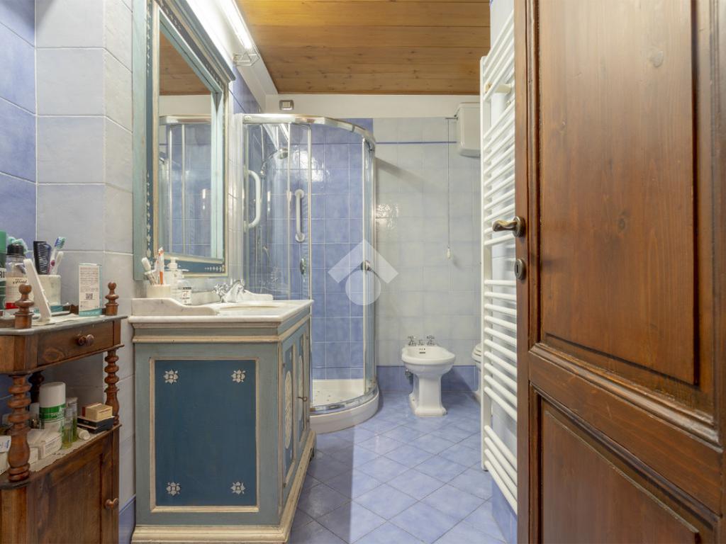 Proseguendo invece lungo il corridoio, troviamo il primo bagno, dotato di box doccia in vetro.